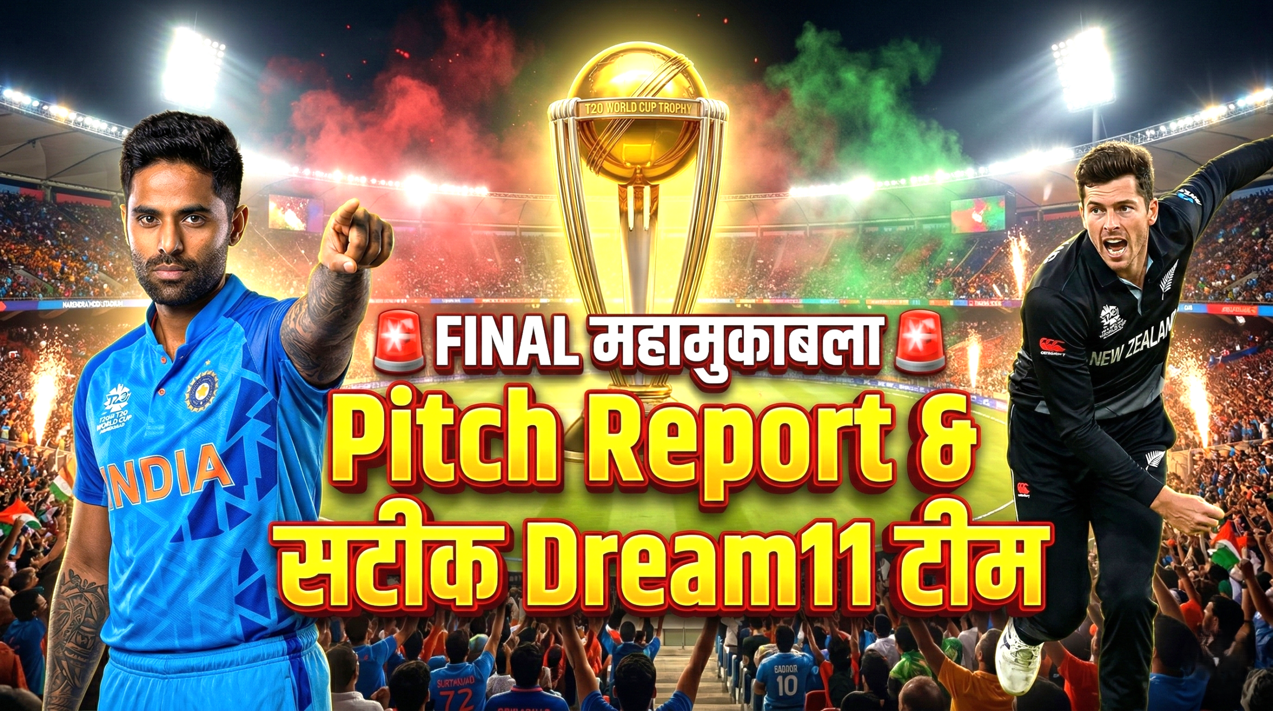 अगर आप Dream11 जैसी फैंटेसी à¤à¤ªà¥à¤¸ पर टीम बनाते हैं या कà¥à¤°à¤¿à¤•ेट के कटà¥à¤Ÿà¤° फैन हैं, तो आज हम आपको IND vs NZ T20 World Cup Final 2026 की à¤à¤•दम सटीक Narendra Modi Stadium Ahmedabad Pitch Report, ताज़ा Head to Head रिकॉरà¥à¤¡ (हालिया 5-0 का इतिहास), दोनों टीमों के पूरे सà¥à¤•à¥à¤µà¥‰à¤¡ और सटीक IND vs NZ Dream11 Prediction के बारे में विसà¥à¤¤à¤¾à¤° से बताने जा रहे हैं।